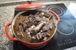 Den Rogout in der Bratpfanne mit Bratfett und 2 im Wasser aufgelösten Fleischbouillon anbraten. Die Saucisson in Scheiben schneiden und zusammen mit dem Schweinswädli und den Spareribs in die Pfanne geben. Eine in Würfel geschnittene Tomate dazugeben. Die Feijoada eine Stunde auf mittlerer Stufe leicht weiterkochen.