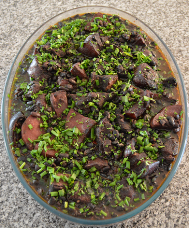 Die Feijoada mit Schnittlauch garnieren und zusammen mit Reis servieren. Zu fast jedem Bohnengericht vermischen die Brasilianer die Bohnen mit Farofa.